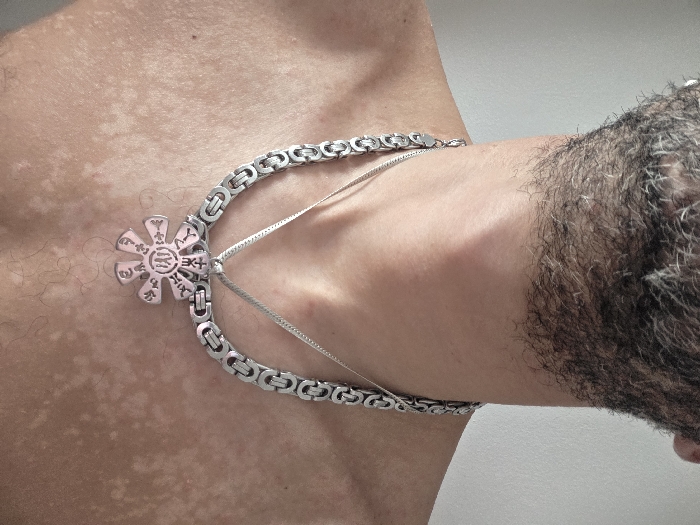A close-up, chest-level photograph taken in London, United Kingdom, depicts the upper torso, neck, and lower facial area of an adult male. The subject has dark, salt-and-pepper facial hair forming a short beard or heavy stubble around the jawline and neck. His skin displays areas of hypopigmentation, appearing as lighter patches against his natural skin tone, predominantly visible across the chest and shoulders. Two silver-colored metal necklaces are worn: a thicker, linked chain (possibly Byzantine style) and a thinner, snake-chain style worn beneath it. Attached to the thicker chain is a distinctive, eight-petaled, flower-shaped pendant, light pink in color with darker recessed markings. These markings include a central symbol resembling 'IYM' or similar script, a cross at the top, and various other symbols or characters inscribed on each petal. The background is a plain, light-colored surface, suggesting an indoor environment.