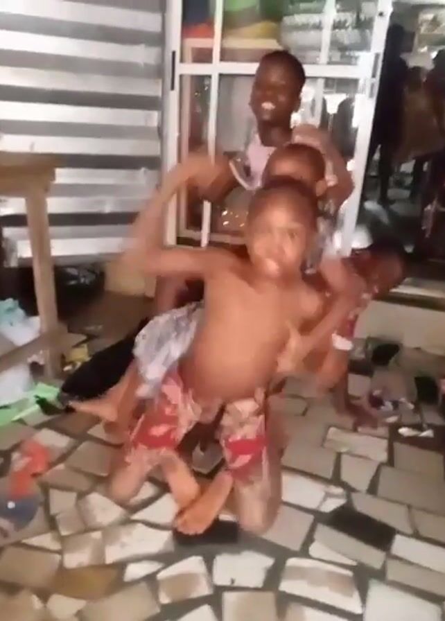 In an indoor setting, four children are close together, creating a chaotic scene. The child in front is shirtless and wears red patterned shorts. He’s on his knees, moving actively with his arms outstretched. Behind him, another child in a floral patterned shirt appears to be crouching or kneeling as well. Behind these two, a taller child is standing, wearing a pink shirt. The fourth child is partially visible, leaning in from the side. All of the children are Black. The floor is tiled in a mosaic pattern with neutral tones. Behind the children, there's a white and glass door, and a wooden stool is visible to the left. The overall atmosphere is energetic and playful.