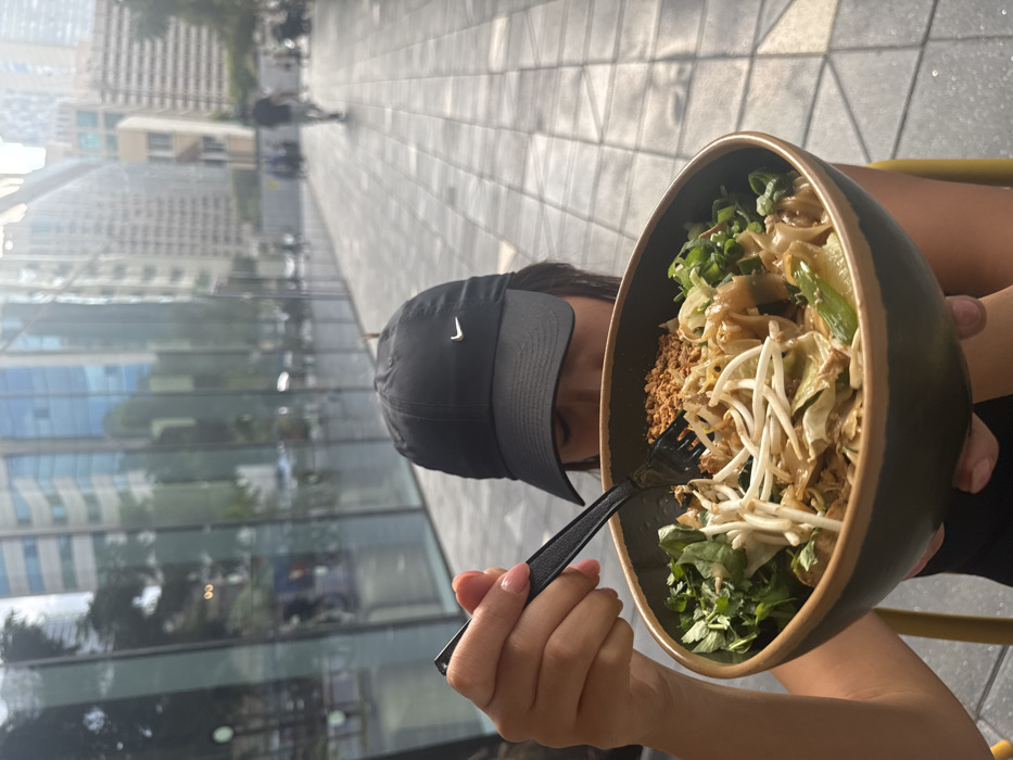 A partially visible individual, obscured by a large bowl of food, is depicted in an outdoor urban setting. The person wears a black Nike baseball cap with a white swoosh logo. The right hand, featuring light pink painted nails, holds a black plastic fork inserted into the food, while the left hand supports the dark green/black ceramic bowl. The bowl contains an Asian-style dish comprising wide noodles, bean sprouts, green leafy herbs, chopped green onions, crushed peanuts, and a visible sauce. The foreground and midground consist of a wide pedestrian walkway paved with gray geometric tiles. The background features multiple modern high-rise buildings with reflective glass facades. Blurred pedestrians are visible walking in the distant background. This scene is located within a modern business district of Ramat Gan, Israel, consistent with areas such as the Diamond Exchange District or adjacent high-tech zones.
