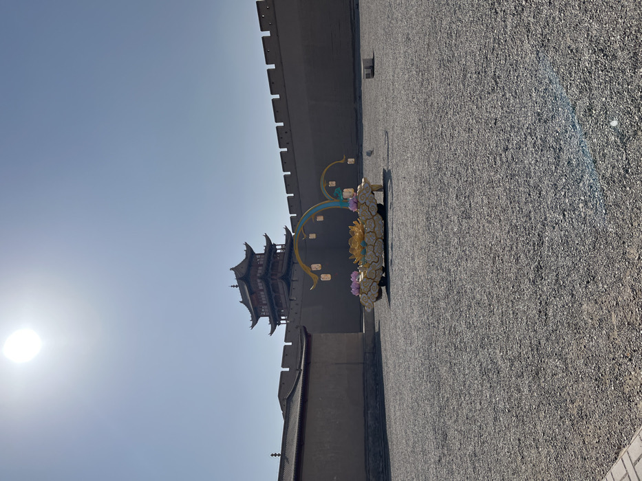 The image displays an exterior view of the Jiayuguan Fortress in Jiayuguan city, Gansu Province, China, under a clear, bright blue sky with the sun prominently visible in the upper left quadrant. In the background, a multi-tiered, dark-roofed traditional Chinese fortress tower is centrally positioned above a substantial tan defensive wall, which extends horizontally across the middle ground and features battlements. To the left, a section of a tan-colored building with a dark roofline is partially visible, connected to another wall. The foreground comprises an expansive area covered in light gray gravel. Centrally located on this gravel is a large, elaborate decorative float. This float features a base shaped like stylized clouds, predominantly white and light blue with yellow-gold accents, supported by a wheeled platform. On top of the cloud base, a large yellow-gold lotus flower is centered, flanked by two smaller pink lotus flowers. Two arched structures rise from the cloud base, each suspending multiple cream-colored lanterns. No individuals are present in the scene. A small white block-like object and a darker, indistinct object are visible on the gravel to the right of the decorative float.