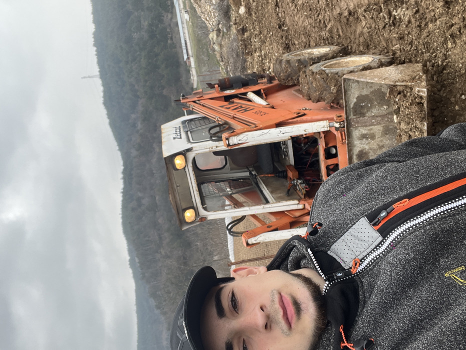 The scene depicts a young adult male taking a selfie on a muddy construction site in Kraino selo, Bulgaria, under an overcast sky