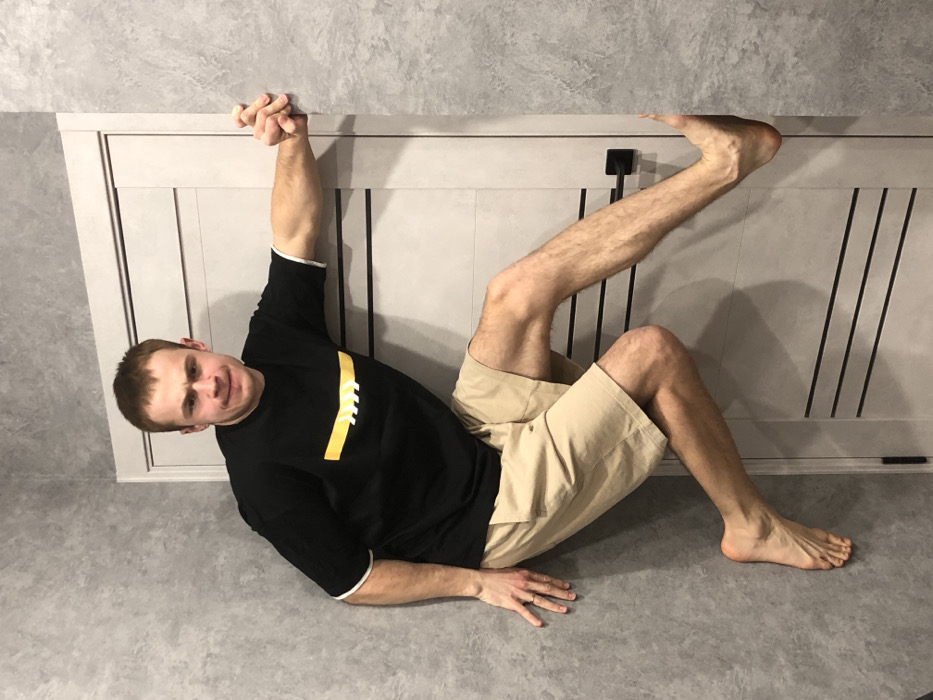 A man in a black shirt with a yellow chevron and khaki shorts leans against a light gray cabinet. One arm is raised, hand gripping the top edge. His opposite leg is lifted and bent, foot near the cabinet's corner. He is barefoot and lies on a gray floor in front of the cabinet, looking at the camera. The room appears modern and minimalist.