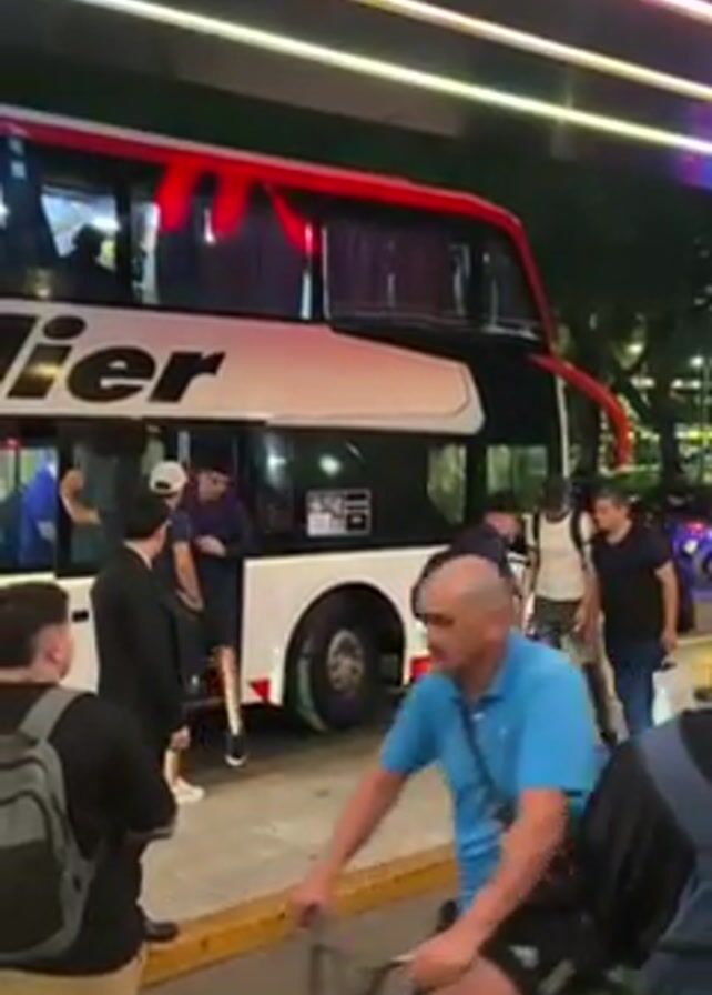 At night, a group of people are disembarking from a double-decker bus