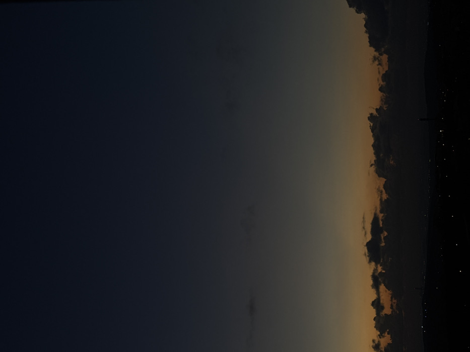 The image displays a panoramic view of the twilight sky over the city of Ariel, Palestinian Territory. The upper sky is a deep, dark blue, transitioning downwards through a gradient of muted grey-blue to a distinct band of orange-yellow just above the horizon. A prominent line of dark, irregular cumulus clouds stretches across the lower sky, silhouetted against the warmer hues. Below this, the landscape of Ariel appears as a dark, indistinct silhouette, punctuated by numerous scattered, faint points of light, indicative of urban illumination. A single, tall, slender, dark vertical structure, possibly a tower, is visible in silhouette on the horizon, slightly right of center. No individuals or specific actions are discernible.