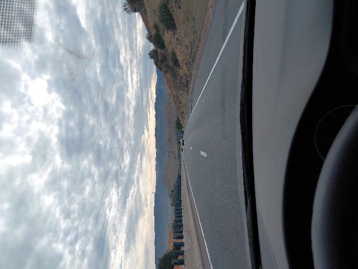 Captured from inside a vehicle, the view shows a winding asphalt road marked with a solid white line alongside a grassy, hilly terrain. A row of guardrails lines the road. The sky, overcast with clouds, occupies a significant portion of the frame. Elements of the vehicle's interior are visible on the right, including parts of the dashboard and steering wheel.