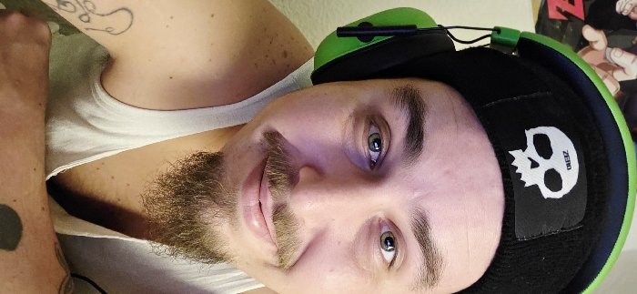 A man wearing a black beanie with a white skull patch and green headphones looks at the camera. He has fair skin, brown hair, and a beard. He's wearing a white tank top. Tattoos are visible on his arm and shoulder. A poster hangs behind him. The image is rotated slightly, presenting an upward angle.