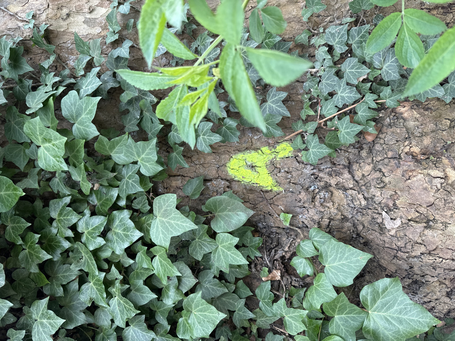 A detailed, vertical close-up shot in Epping Forest, United Kingdom, depicts a section of a tree trunk heavily covered by dark green common ivy (Hedera helix). The textured, brown-grey bark of the tree is visible through gaps in the dense ivy foliage. A prominent capital letter 'A' is painted in bright, vivid yellow directly onto the tree bark towards the lower center-right of the frame. The yellow paint exhibits minor cracking and appears to have been applied with spray paint, contouring to the bark's rough surface. Additional lighter green foliage, distinct from the ivy, is visible in the right foreground, slightly out of focus. No people or interactions are visible.