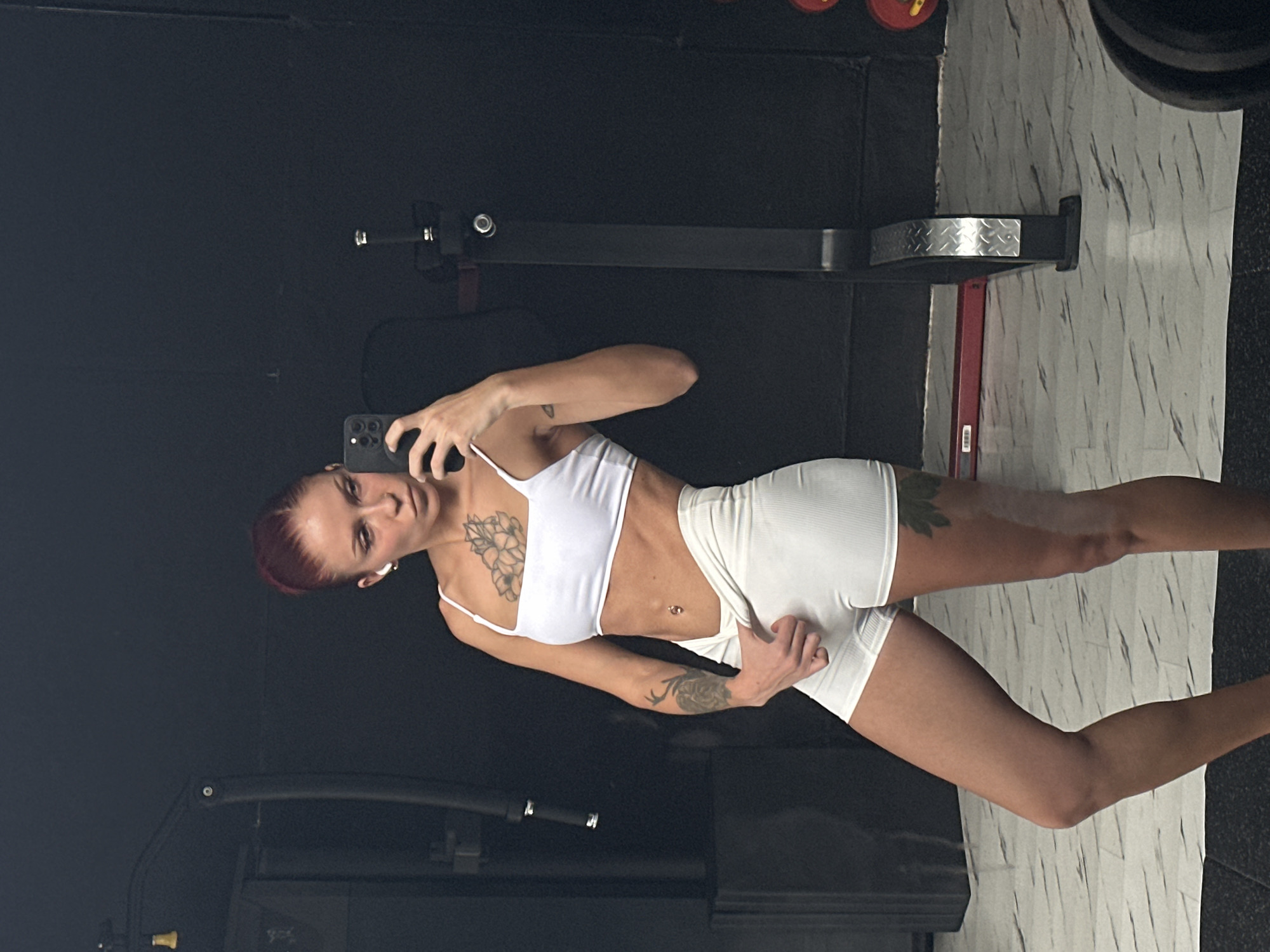 This image captures a female subject, positioned for a mirror selfie within a gym setting, identified as being in Kerobokan, Indonesia. The subject has reddish hair styled back and is wearing a white square-neck sports bra and white ribbed athletic shorts. Visible tattoos include a large floral design on her upper left chest, an antlered animal on her upper left arm, a small triangle on her right bicep, and a large leaf design on her lower left thigh. She has a navel piercing and wears white wireless earbuds. Her right hand holds a dark smartphone, directed towards the mirror. Her left hand is placed over the crotch area of her shorts. The background consists of dark walls and reflections of gym equipment, including a machine with a yellow component and red weight plates. The floor is segmented, featuring a light-colored patterned tile in the midground and a dark, possibly rubberized, mat in the foreground.