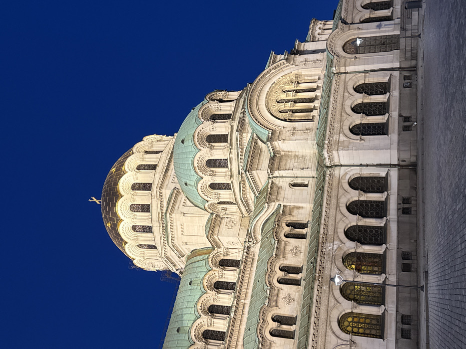 The image displays a detailed view of the St. Alexander Nevsky Cathedral in Sofia, Bulgaria, captured during twilight or night. The cathedral's grand facade, constructed from light-colored stone, is illuminated, contrasting with a deep, clear blue sky. A large, central golden dome, topped with a golden Orthodox cross, dominates the upper section. Surrounding this are several smaller domes and roof sections covered in verdigris-patinated copper. The building's intricate architecture features multiple tiers of arched windows, some revealing an interior warm yellow light, while others appear dark with decorative grilles. The lower portion of the image shows a cobblestone-paved ground. A tall, dark lamppost with an illuminated spherical light fixture stands in the lower-left foreground. No individuals are visible, and the scene is static.
