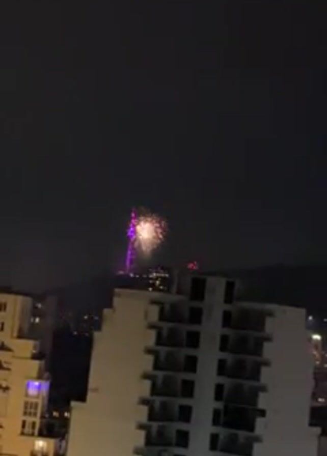 fireworks exploding in the night sky above a city. The fireworks are launched behind a tall TV tower that is illuminated with purple lights. The camera angle is from a high vantage point, looking down at the city skyline. Several tall buildings are visible in the foreground, with their windows lit up. The sky is dark, and the fireworks create bright flashes of light and smoke. The camera zooms in and out slightly, following the action of the fireworks. There are no people visible in the video. The overall impression is one of celebration and excitement.