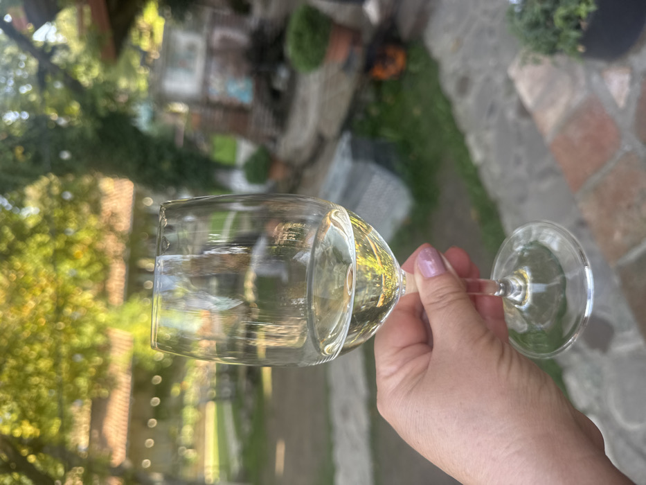 - "A close-up image depicts a fair-skinned hand, exhibiting manicured nails with light pink polish, holding the stem of a clear wine glass" by FM-Sep6K2, licensed under CC BY 4.0
