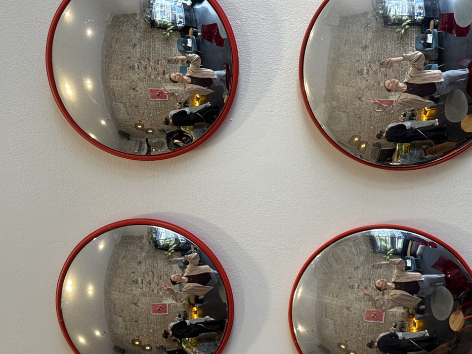 - "The image displays four circular, convex mirrors with red frames, mounted in a 2x2 grid on a plain white wall, reflecting an interior scene from a cafe or bar in Tel-Aviv, Israel" by FM-Z81NG3, licensed under CC BY 4.0