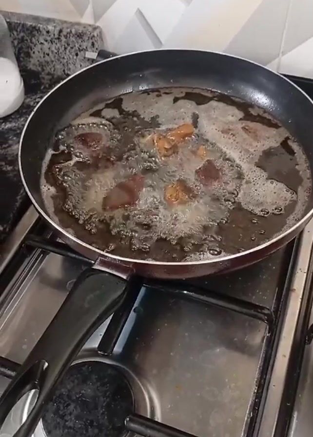 kitchen setting. Initially, a black frying pan filled with oil and pieces of meat frying is visible on a gas stove. The frame then shifts to a saucepan covered with a glass lid, also on the stove. The final shot focuses on a person mashing what appears to be potatoes in a green bowl with a masher near a sink.