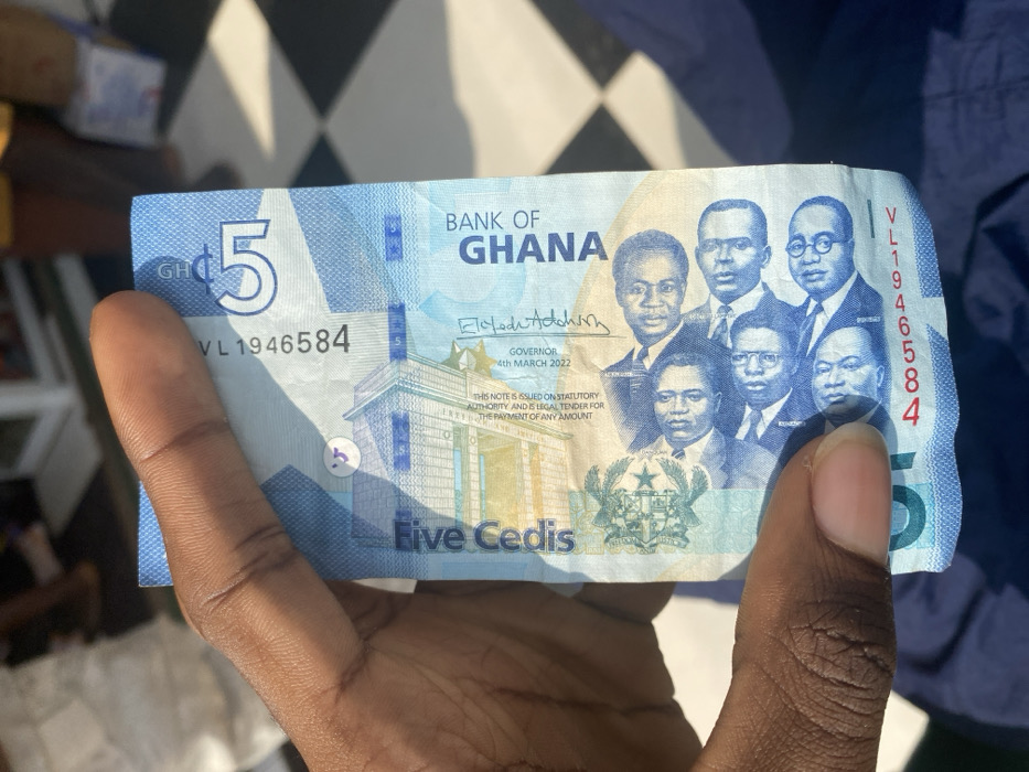 - "In Joma, Ghana, a dark-skinned right hand is centrally positioned, holding a crumpled 5 Ghanaian Cedi banknote vertically" by FM-IRJUp1, licensed under CC BY 4.0