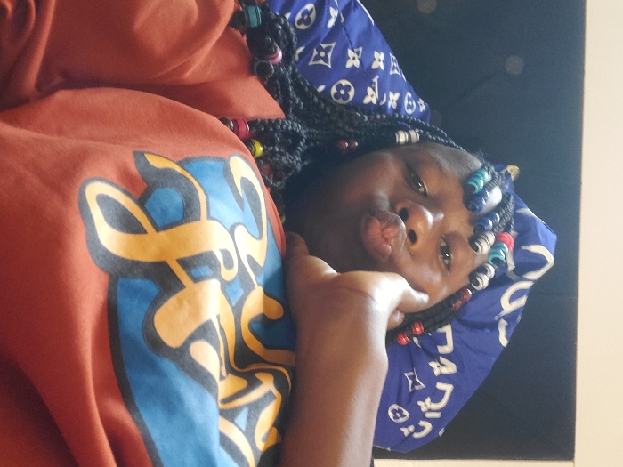 A medium close-up, slightly upward-angled photograph depicts an individual indoors. The specific location within Kuje, Nigeria, is not discernible from the image. The individual has dark skin and dark braided hair styled with numerous colorful beads in red, black and white stripes, blue, green, and yellow. Their lips are pursed into a 'kissing' gesture, and their right hand is positioned with fingers slightly curled against the right side of their face/jawline. They wear an orange-red long-sleeved shirt with a graphic design on the chest: a light blue circular background overlaid with yellow, stylized lettering that appears to read "FUN" or similar, outlined in dark grey. Behind the individual's head is a blue fabric object, possibly a pillow or head covering, patterned with repeating white motifs resembling the Louis Vuitton monogram. The background consists of a dark, featureless surface, likely a headboard or wall.