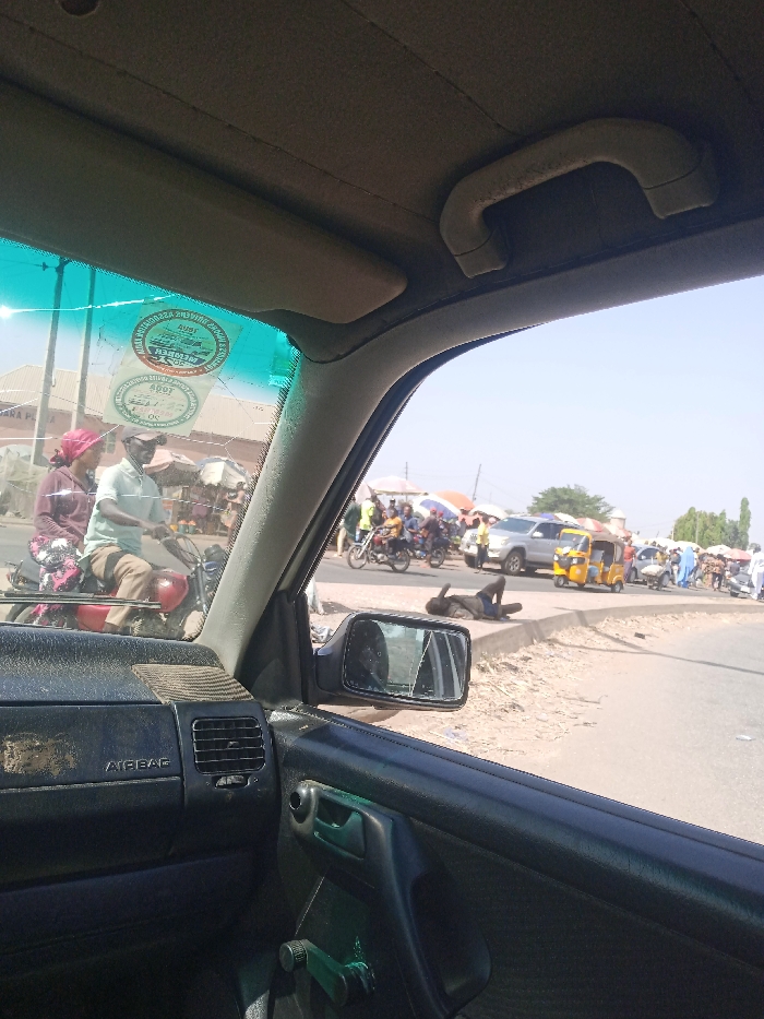 The image depicts an outdoor scene in the city of Bwari, Nigeria, viewed from the interior of a vehicle, specifically through the front passenger side. The vehicle's dashboard, air vents, "AIRBAG" label, and door panel with a manual window crank are visible in the foreground. The windshield exhibits multiple cracks and two circular stickers. The passenger side exterior mirror is visible, showing a crack in its reflective surface. Outside the vehicle, the environment is sunny with a clear sky. A paved road runs horizontally across the mid-ground. To the left, a man wearing a light-colored shirt, dark trousers, and a cap is operating a red motorcycle. A woman with a red head covering and maroon top is seated as a passenger behind him. Directly ahead and slightly to the right of the observer's vehicle, a person dressed in dark clothing is lying face down on the dusty, unpaved shoulder adjacent to the road. Further down the road and in the background, there is significant street activity. Numerous motorcycles, including a group of riders, are present. A yellow autorickshaw (Keke Napep) and several cars, including a silver SUV, are part of the vehicular traffic. Multiple individuals are visible on foot and congregated near what appear to be market stalls or vendor setups, indicated by various umbrellas and awnings. Buildings and power lines are discernible in the far background. The overall scene suggests a busy urban or semi-urban street.