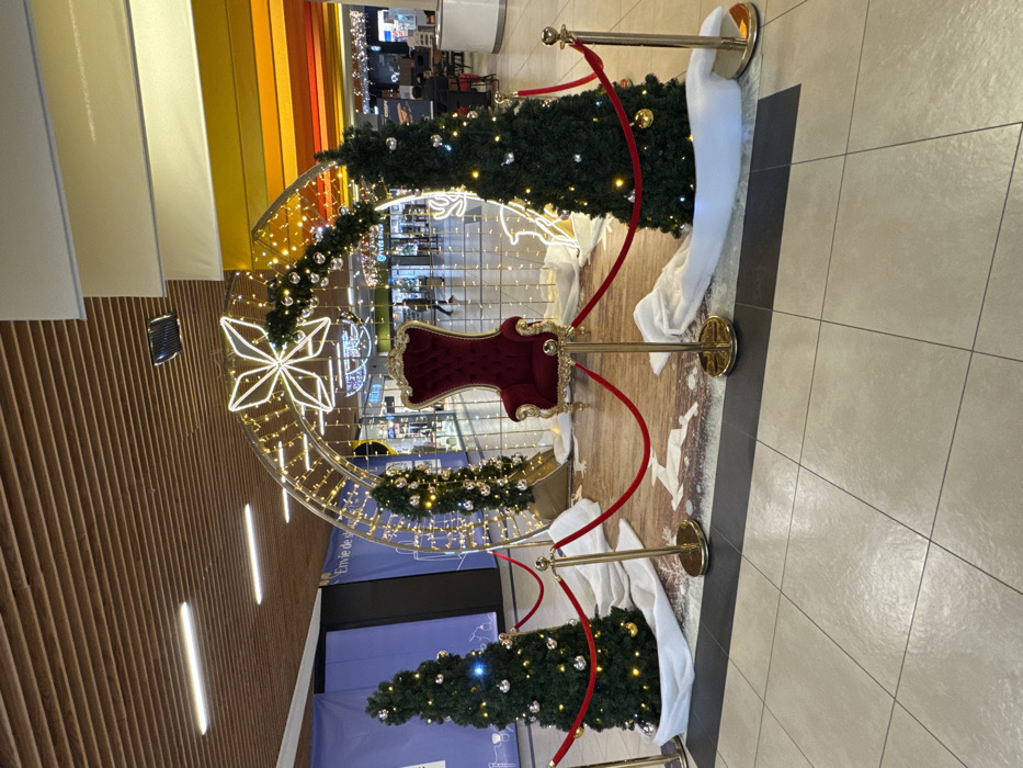 A festive Christmas scene features a red throne encircled by a lighted archway adorned with garlands and lights. Two decorated Christmas trees flank the display, enclosed by velvet rope stanchions. Artificial snow and a printed backdrop with reindeer figures add to the holiday ambiance. The setup is positioned indoors on a tiled floor, with a view into a shopping mall in the background.