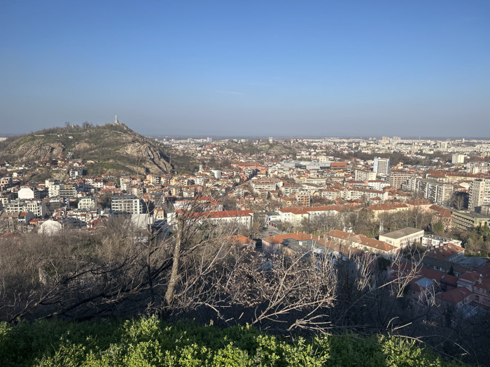 The image displays an elevated, wide-angle panoramic view of Plovdiv, Bulgaria, looking across the cityscape from an elevated position