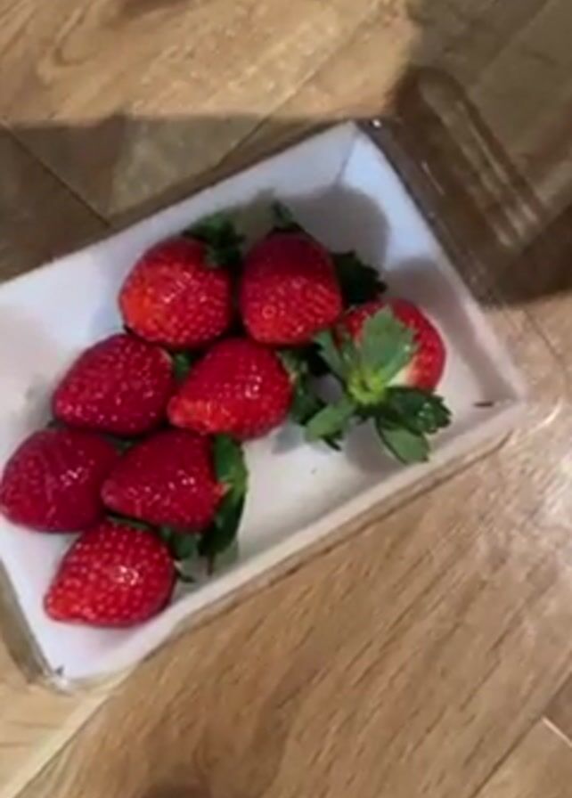 On a wooden surface, a small rectangular container holds nine ripe strawberries. The container's base is white with a clear plastic lid. The strawberries are bright red and have their green stems intact. A hand with long, painted nails reaches into the container. A voice says "It's like 10 euros, but it's really good."