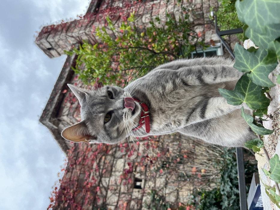 The scene is located in Pržno, Montenegro, under an overcast sky. A grey tabby domestic short-haired cat, wearing a red leather collar with a silver buckle, is seated prominently in the foreground on a low, light-colored stone surface. The cat is angled slightly to its right, with its head turned to the right, and its tongue is extended, licking its pink nose. Its eyes are a yellowish-green. White whiskers are visible around its snout. Behind the cat, a multi-story stone building with a traditional architectural style is visible, its facade extensively covered by dense, vibrant red autumnal foliage. To the right of the cat, a small green tree or bush with scattered light-colored, round fruits is situated in front of the building. In the immediate foreground, green ivy leaves with distinct lobes are visible trailing across the rough, pebbled surface of the stone structure where the cat sits. A dark metal railing is partially visible in the mid-ground to the right, and a blue and white sign is partially visible on the far left. No human subjects are present.