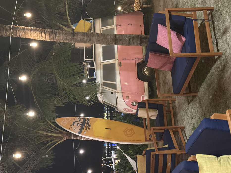 This nighttime image depicts an unoccupied outdoor lounge area in Nha Trang, Vietnam. The scene is illuminated by overhead string lights, casting light on a sandy or dirt ground. A vintage two-tone pink and white Volkswagen Type 2 van is parked centrally, fitted with a roof rack carrying luggage and a yellow surfboard. To its left, a tall yellow stand-up paddleboard, branded "GO" and featuring a marine graphic, leans against a palm tree. Multiple wooden-framed outdoor chairs and a loveseat, equipped with dark blue cushions and assorted throw pillows (beige, pink, yellow), are arranged in the foreground. Several palm trees are visible throughout the composition. In the distant left background, a body of water shows reflections of urban or vessel lights. No people are present.
