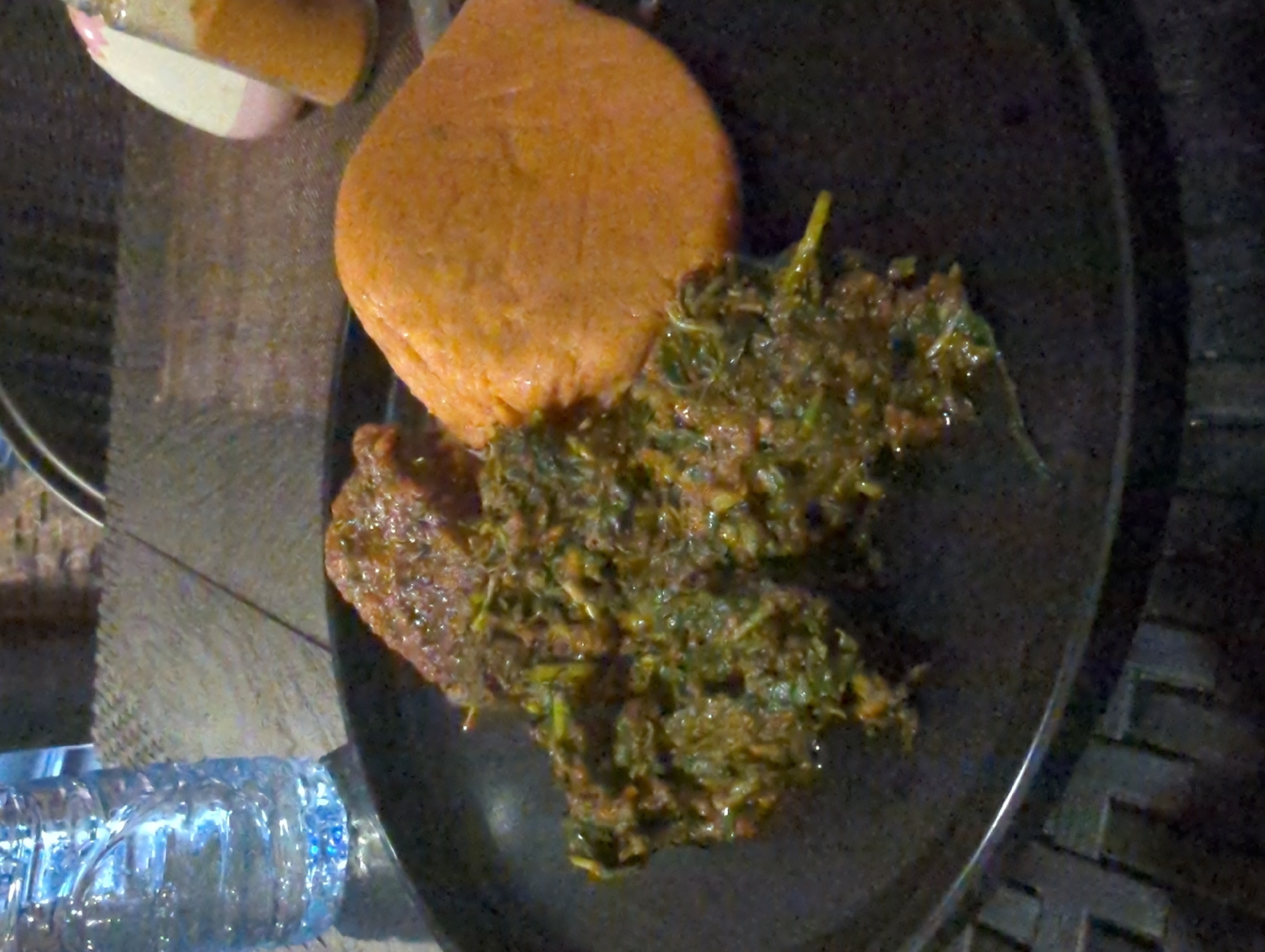 A plate of food, including a round orange doughy item, stewed green vegetables, and meat, is placed on a dark plate. Part of a water bottle is visible in the lower left. A small dish with beige-colored food sits next to the plate. The setting appears to be outdoors with dark surroundings, possibly indicating nighttime. There is no evidence in the image to confirm the location is Shaba, Nigeria.