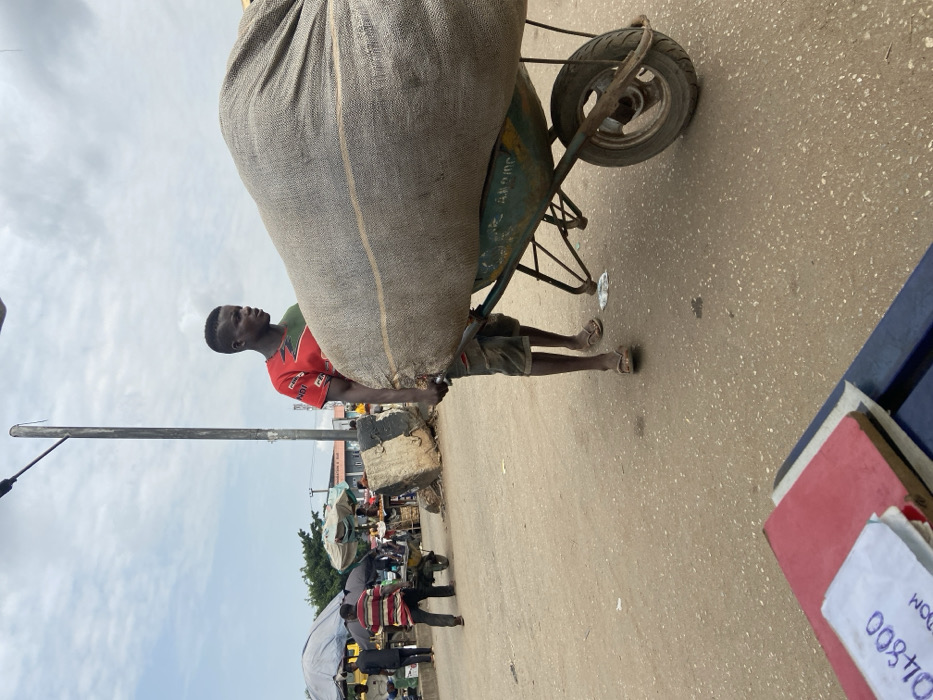 A street-level scene in Onitsha, Nigeria, depicts a young adult male pushing a heavily loaded wheelbarrow