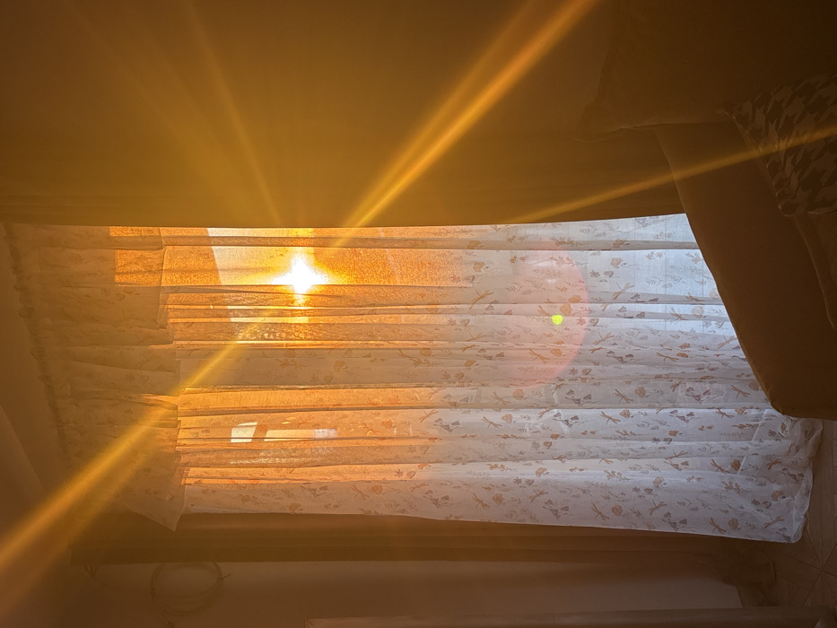 This image depicts an interior room located in Kunje, Montenegro. Intense, golden sunlight, indicative of either sunrise or sunset, enters from a window positioned centrally on the right side of the frame. The window is obscured by sheer, light-toned curtains adorned with a repeating pattern of flora and dragonflies. Strong lens flare radiates diagonally from the light source, casting a prominent orange hue across the scene and illuminating the adjacent wall to the right. In the bottom right foreground, the armrest of a light-brown upholstered furniture piece, possibly a sofa or chair, is visible, partially covered by a dark patterned cushion. A section of light-colored tiled flooring is discernible in the bottom left, alongside a wall featuring a white cable and an indistinct fixture. No human figures are present.