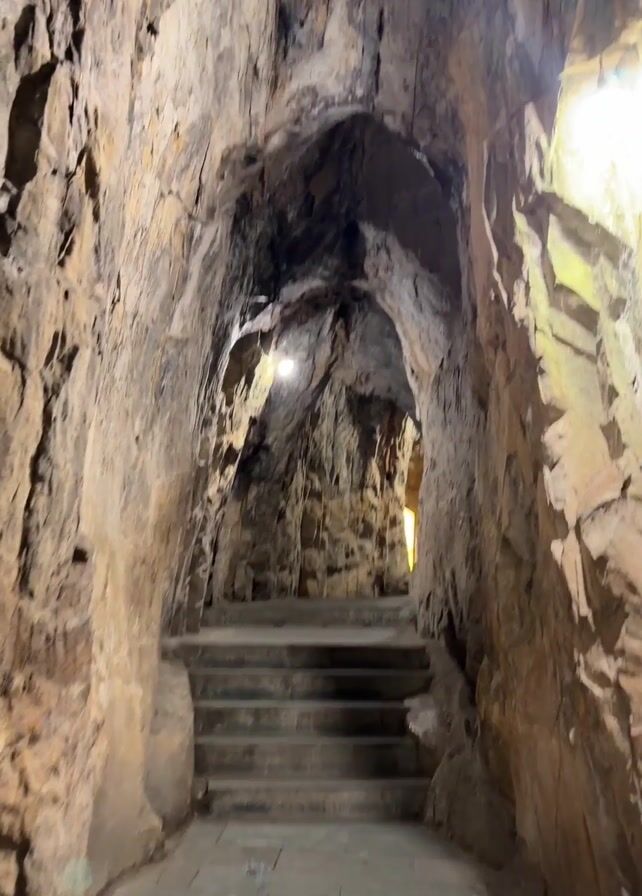 interior of a cave or tunnel. The walls are rough, rocky, and appear to be made of a light-colored stone. There are stone steps leading upwards, and light fixtures provide illumination. The camera moves erratically, at times blurring the scene. The overall impression is of a narrow, enclosed space carved into rock.
