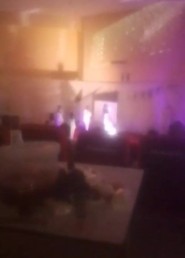 room lit with colored lights, mainly pink, yellow, and blue. There are people, possibly children, standing on a slightly elevated stage or platform at the back of the room. A screen or blank wall behind them has a rectangular projection of speckled light. The focus is soft and the image is somewhat blurry. In the foreground, there are indistinct objects and possibly furniture.