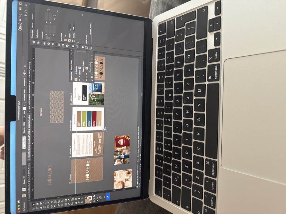 A silver Apple MacBook laptop is prominently displayed, its screen showing an active session of Adobe Illustrator 2026. Multiple files are open, including "Amaral Moodboard.ai," "Identidad Grafica Nomada.pdf," and "BASE LOGO NOMADA (Recovered).ai," all related to branding for "NÓMADA." The screen presents various design elements: a "NÓMADA" logo, textural patterns, and several artboards illustrating brand guidelines. These include "Valores de la marca" (Brand Values), "Tipografía" (Typography), "Paleta de Color" (Color Palette) displaying swatches of browns, greens, blues, and reds, and product mockups featuring a dark green insulated bottle and a blue tote bag, both with the NÓMADA logo. Below the main design area, three smaller images show additional product applications, including packaging and another bottle. The laptop's keyboard is visible in the foreground, featuring a QWERTY layout with Spanish characters (e.g., Ñ). The immediate background around the laptop is out of focus, suggesting a soft surface like a blanket or cushion, with a faint, blurred reflection of what appears to be a person's hands or arms at the top edge of the screen. The scene is located in Santiago Yancuitlalpan, Mexico.