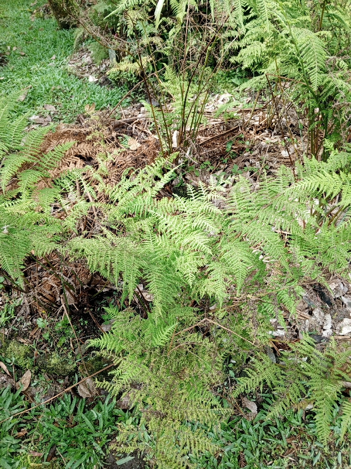 The image depicts a dense, natural vegetated area. Numerous green ferns, displaying complex fronds, populate the foreground and mid-ground. Areas of brown, desiccated fern fronds and organic detritus, including twigs and leaves, are interspersed with the vibrant green vegetation. The ground is a mix of visible soil, patches of green grass, notably in the lower left quadrant, and scattered light-colored debris. Thin, dark brown stems, likely from ferns or small shrubs, stand vertically in the mid-section. No human subjects, man-made structures, or artificial objects are visible. The precise location within Đà Nẵng, Vietnam, is not discernible from the image; it depicts an overgrown, natural landscape consistent with a park or undeveloped area.