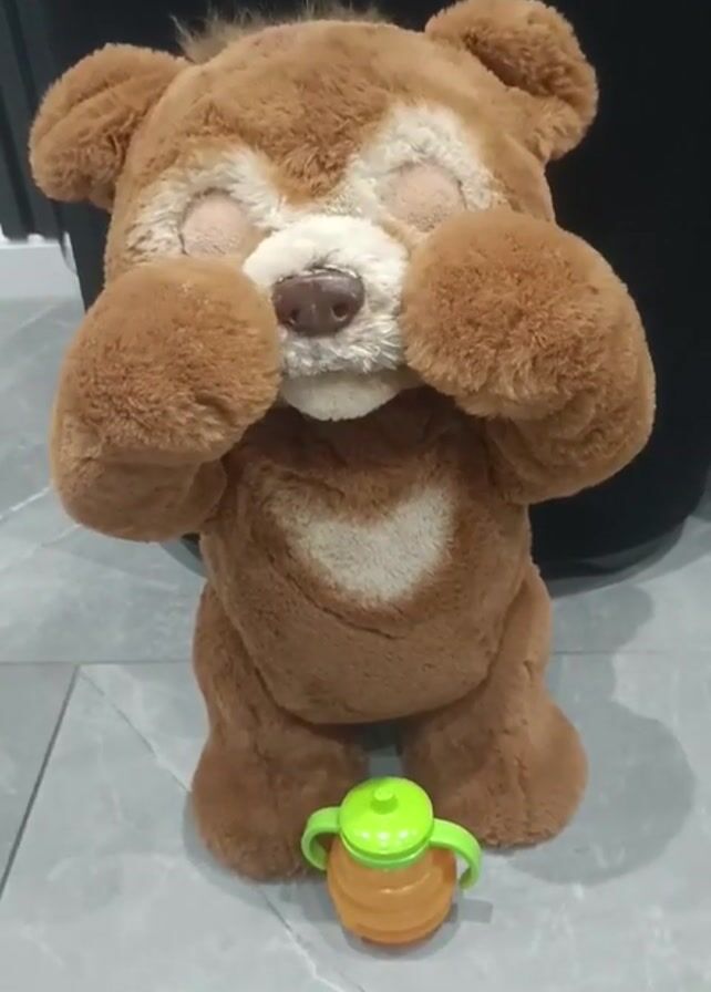 brown animatronic teddy bear standing on a gray tile floor. The bear's eyes are closed, and it is holding its paws up to its face. There is a small, orange and green honey pot toy at the bear's feet. The background is black. It is possible that the bear is saying a prayer or playing peek-a-boo.