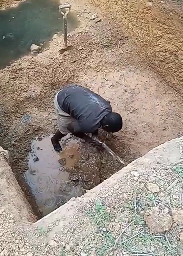 A man is inside a square pit, using a tool, seemingly a hoe, to move mud and water. The pit is partially filled with murky water. The man is wearing a dark shirt and light-colored shorts. A shovel stands upright nearby on drier ground. The pit is in a dirt area with sparse vegetation.