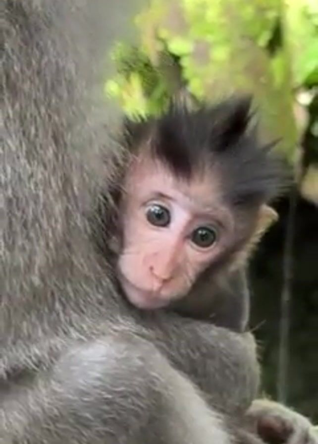 baby monkey being held by an adult monkey. The baby monkey has wide eyes and a pink face, and its fur is dark on the top of its head and lighter on its body. It sticks its tongue out slightly. The adult monkey has gray fur. There is greenery in the background.