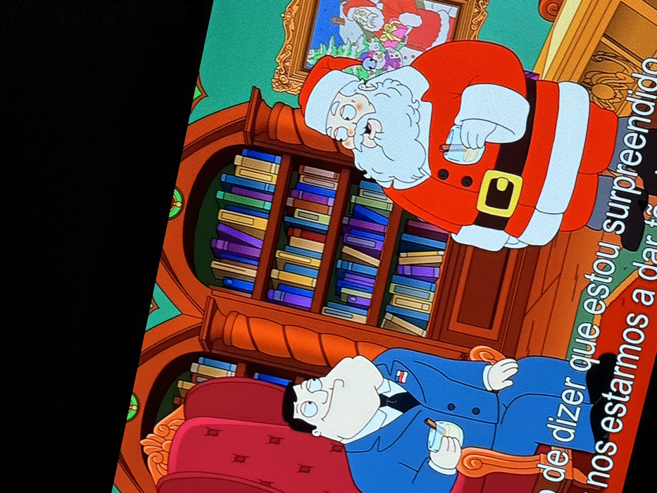 An animated scene features Santa Claus, in his red suit and white beard, floating above a wooden bookcase filled with colorful books. Below him, a man in a blue suit is lounging on a red chair, also holding a drink. A framed picture of Santa and possibly other characters hangs above the bookcase. The scene has a light green background. Portuguese subtitles are also visible along the bottom.