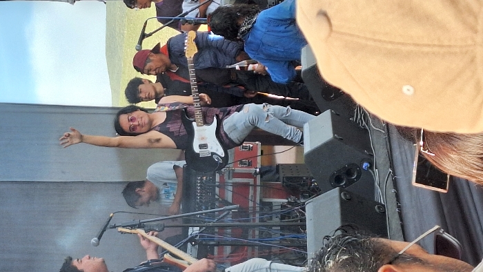 band performing on stage, as viewed by an audience member standing in front of the stage in Sabandía, Peru