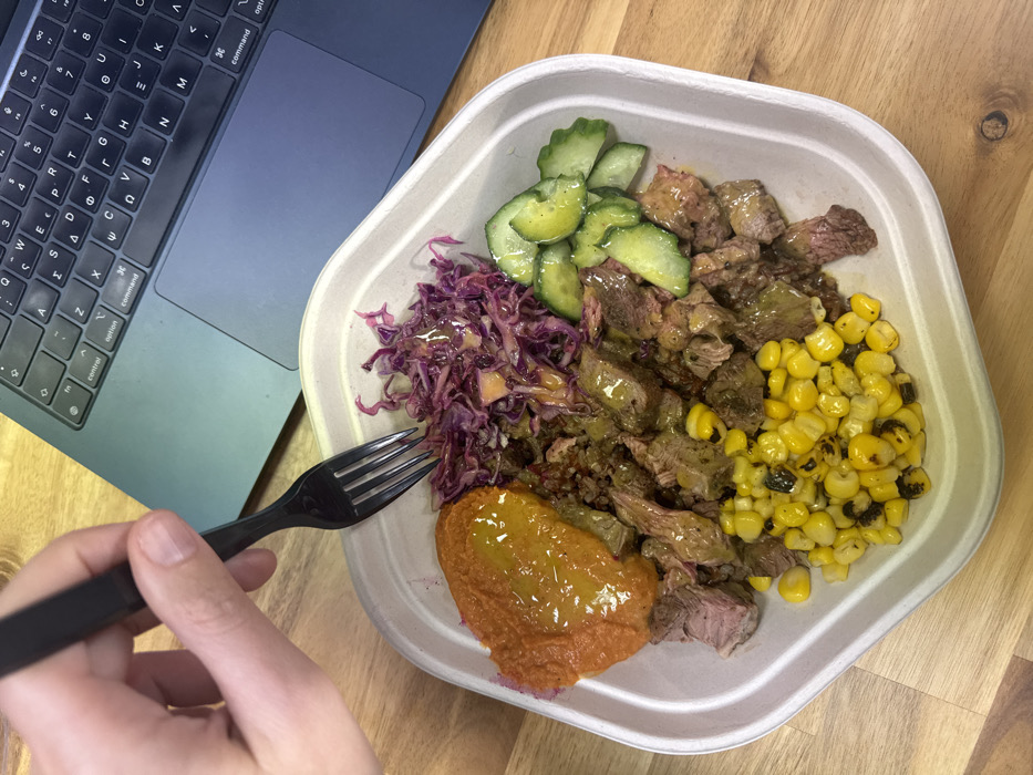 A person holds a black fork near a square container filled with a meal. The meal contains grilled steak pieces, cooked corn kernels, sliced cucumbers, red cabbage slaw, and a spread of orange sauce. A portion of a silver laptop is visible in the upper left corner of the frame. The surfaces, including the laptop, fork, and food container, rest on a light brown wooden table.