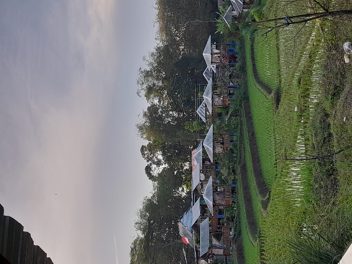 The image displays a rural landscape in Penanggungan, Indonesia. In the foreground, terraced rice paddies are visible, containing young green rice plants partially submerged in water, with distinct earthen banks separating the levels. Above these paddies, a cluster of eight elevated, open-sided wooden structures, resembling gazebos or bungalows, are situated. These structures feature light-colored, peaked roofs, possibly corrugated, and some incorporate blue support pillars or railings. A larger building with a dark roof and an Indonesian flag flying is positioned behind the leftmost gazebos. A dense line of green trees forms the background horizon. The sky above is uniformly overcast and light grey. A dark corrugated roof edge is present in the upper left corner of the frame, indicating the vantage point. No individuals are clearly identifiable, and no specific actions or interactions are discernible within the scene.