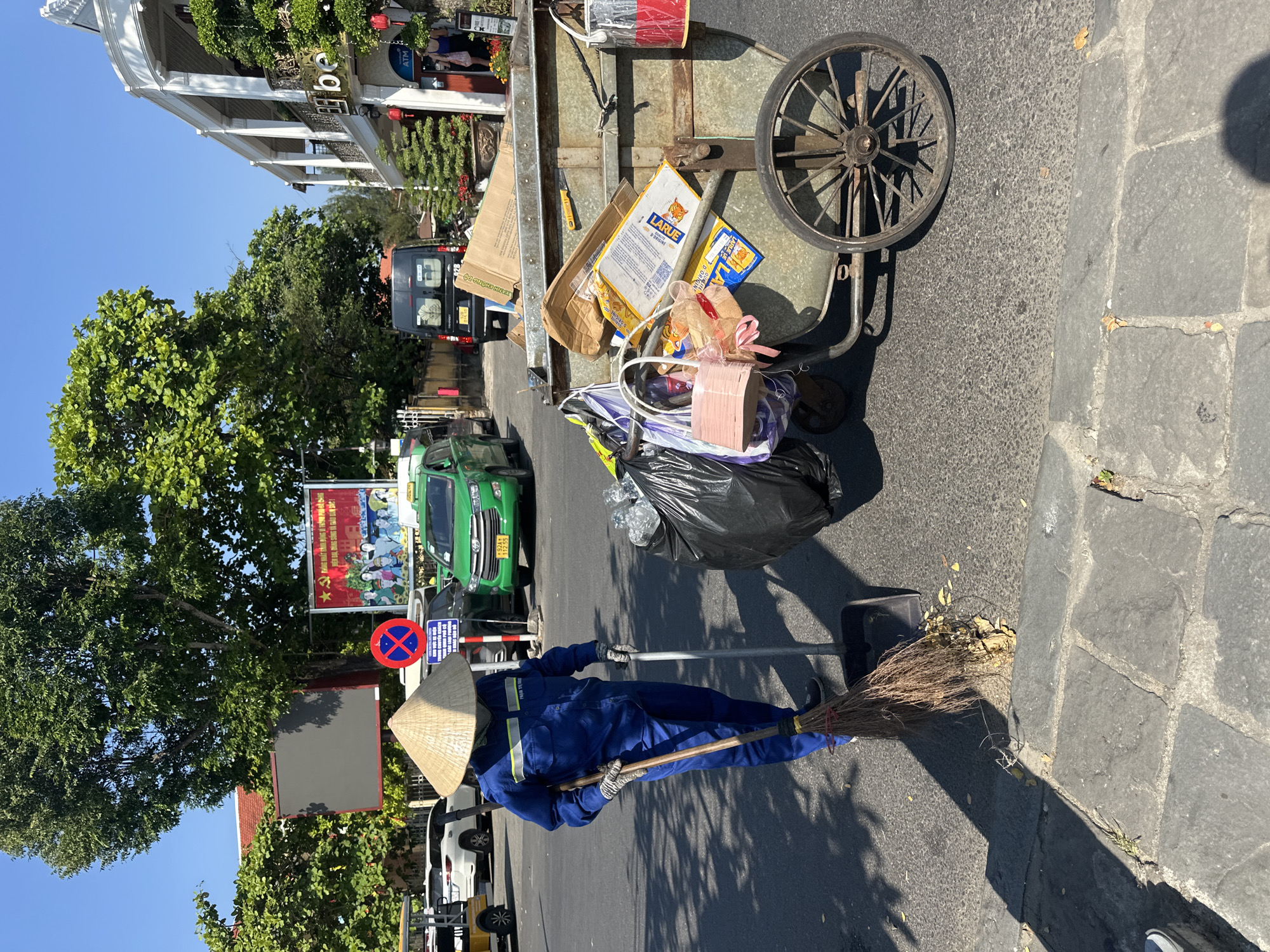 - "A street cleaner, dressed in blue work overalls and wearing a conical straw hat, sweeps a city street in Hội An Ward, Vietnam, with a traditional straw broom" by FM-IHyJw1, licensed under CC BY 4.0