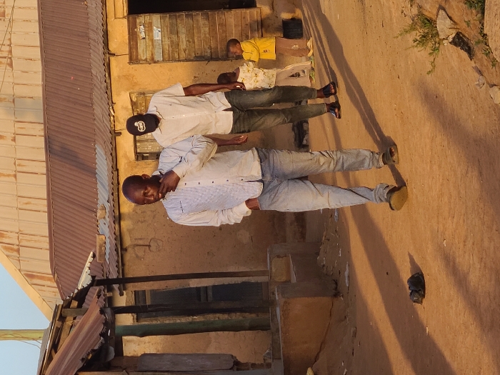 This image captures a street scene in an unconfirmed location within Jos, Nigeria, at what appears to be late afternoon or early morning due to long shadows and warm lighting. The foreground features an unpaved, reddish-brown dirt path. Centered, a male subject, approximately 30-45 years old, with dark skin and a bald head, walks leftwards. He is dressed in a light-colored, vertically striped long-sleeved button-up shirt, light blue jeans, and dark sandals. His right hand is raised to his chin/mouth area. To his right and slightly behind him, a second male subject, also appearing 30-45 years old, walks in the same direction. He wears a light short-sleeved collared shirt, dark trousers, and a dark baseball cap. His footwear consists of dark sandals. In the mid-ground, a crumpled dark object, possibly a plastic bag, rests on the dirt path to the left of the first subject's feet. Further back on the right, two small children are partially visible, standing near a building entrance. One child wears a light-colored top, and the other wears a bright yellow top. The background consists of several single-story structures with light brown, rough-textured walls, suggestive of mud or adobe construction. These buildings are topped with weathered, corrugated metal roofs exhibiting rust and discoloration. Details include small windows and wooden door frames. On the far left, a structure has a partial corrugated metal overhang. The overall environment suggests a residential or semi-urban area.