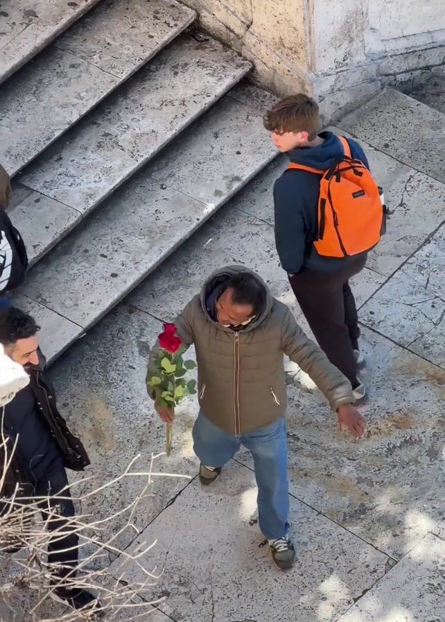 A man holding several red roses approaches a pair of men standing in a plaza. He offers the roses to the man wearing a black jacket. The second man walks past. The man is smiling as he holds the roses. People can be seen walking in the background. The plaza features marble stairs.