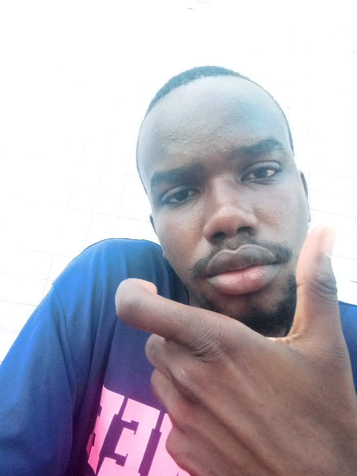 A dark-skinned adult male is depicted in a close-up, eye-level shot, appearing to be in the city of Mtopanga ward, Kenya