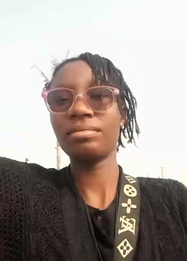 A woman with dark skin, wearing pink-tinted glasses and a black sweater, is walking down a road. She has dreadlocks and a Louis Vuitton-style strap across her chest. The road is paved, with a curb and some dirt and vegetation to the side. There are houses and trees visible in the background, and a utility pole is in the distance. The sky is overcast. At one point she smiles and makes a peace sign. The video appears to be a selfie.