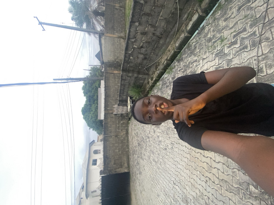 A young man stands outside, holding a finger to his lips in a gesture for silence. He wears a dark shirt. Behind him, a stone wall runs alongside a patterned concrete walkway. Further back, buildings are visible beyond the wall, along with trees and utility poles. The sky is overcast. The photo appears to be taken at a slightly tilted angle.