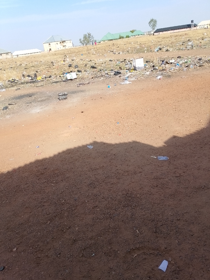 A sunlit, brown, dirt road covers the lower portion of the image, partially obscured by shadow. Trash litters a grassy field leading to distant buildings. The buildings are diverse in design, some with light-colored roofs and others with green. A blue sky is visible.