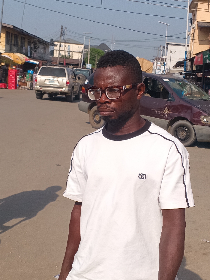 A man with dark hair and glasses stands on a sunny street, wearing a white t-shirt with black trim. Cars are parked and moving in the background, alongside buildings, utility poles, and vendors. The street surface is visible in the foreground, casting a shadow of the man to his left. The overall scene suggests an urban setting with ordinary street life.