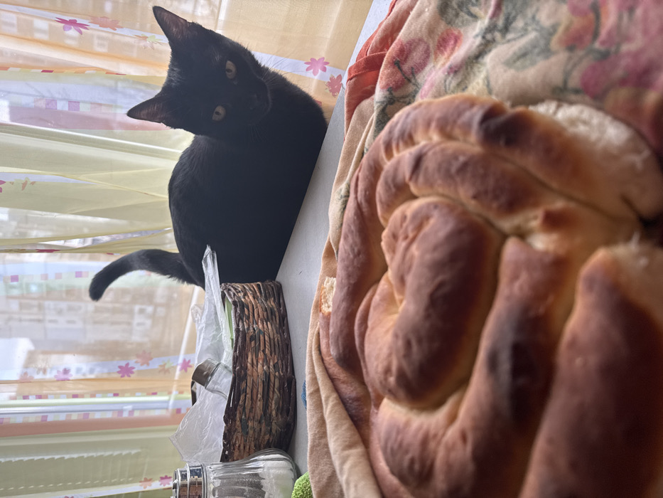 This image depicts an interior residential scene located in the city of Vratsa, Bulgaria. In the foreground, a large, circular, spiral-shaped baked good, consistent with a banitsa or similar pastry, rests on a light-colored surface, partially covered by a floral-patterned cloth with red, orange, and pink hues. A small piece of the baked item appears to be broken off from its top edge. To the left, a glass salt shaker with a silver-toned cap, partially filled with white granular material, stands next to a small, dark brown woven wicker basket. The basket contains crumpled white plastic or paper and a small clear glass bottle with a cork stopper. Behind these objects, a short-haired black cat is positioned on the same surface, its body partially obscured by the basket and its head turned towards the baked goods and the camera. The cat has yellow/amber eyes with constricted pupils, indicating alertness. Its tail is curved upwards. The background features a window covered by sheer, light yellow curtains adorned with a repeating pattern of pink or orange floral motifs. Through the curtains, blurred outlines of multi-story urban apartment buildings are visible under bright daylight, suggesting an elevated residential view. Natural light illuminates the scene from the window, casting soft shadows.