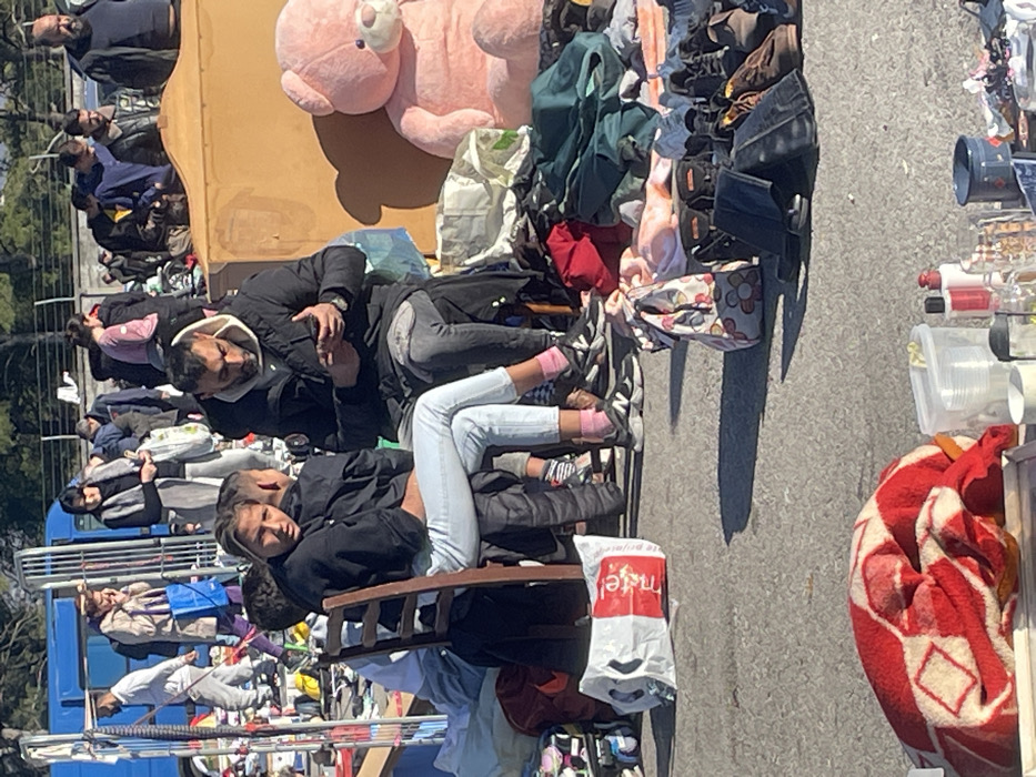 The scene depicts an outdoor market in the city of Podgorica, Montenegro, under bright daylight conditions with distinct shadows indicating an overhead sun. The ground is paved, appearing as asphalt. In the foreground, a red and white patterned blanket is partially visible on the lower left. To its right, a collection of clear plastic cups, bottles with red caps, and various glassware items are arranged on a surface. A white plastic shopping bag with red 'm:tel' text lies on the ground to the left, near the leg of a wooden chair. Further right, a patterned fabric bag and an assortment of clothing and numerous pairs of shoes (including sneakers and boots) are displayed directly on the ground. A large, seated pink teddy bear is positioned on the right, adjacent to a light-colored wooden furniture component, possibly a headboard. Two primary individuals are seated centrally. On the left, a young female with dark hair, wearing a black long-sleeved top, light blue jeans, pink socks, and black sneakers, sits on a wooden chair. She is looking directly towards the viewer with a neutral expression. Partially obscured behind her are at least two other individuals, one with dark hair, and a child's legs with striped socks are visible beneath the chair. To her right, a male with a dark beard and short dark hair, wearing a black puffer jacket with a light-colored hood and dark pants, sits on a chair. He is focused on a black smartphone held in both hands. A watch is visible on his left wrist. The background shows a densely populated market area with numerous individuals walking, standing, and interacting amongst market stalls. Various goods, including clothing and shoes, are spread across these stalls. A blue bus or large van is partially visible behind market structures on the left side. Further back, a metal fence or railing and trees are present under a clear blue sky.