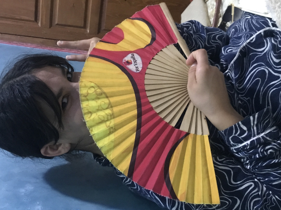 An individual is depicted indoors in Ouislane, Morocco, holding a decorative hand fan partially obscuring their face
